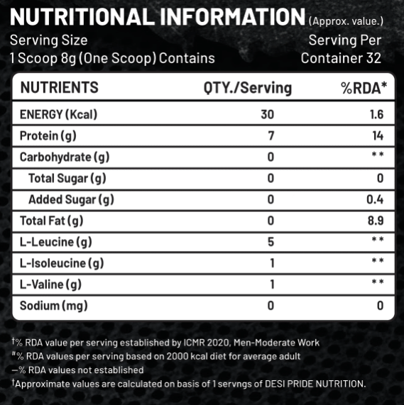 DESI PRIDE NUTRITION BCAA Include the three essential amino acids Leucine, Isoleucine and Valine in 5:1:1 ration.