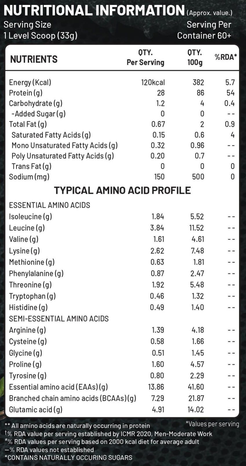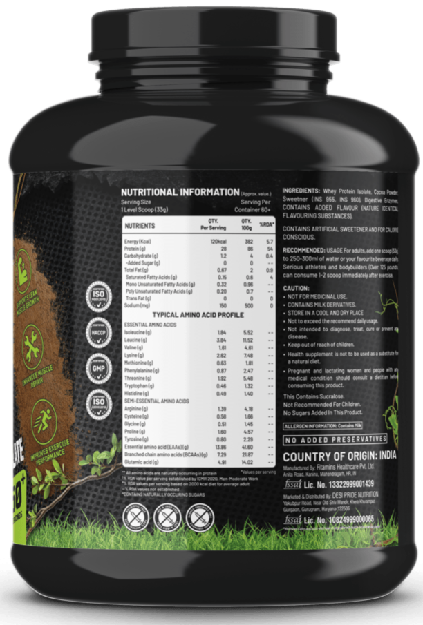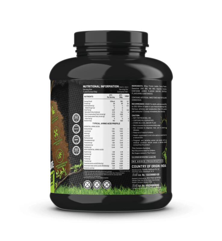 DESI PRIDE NUTRITION WHEY PROTEIN ISOLATE is developed keeping in mind the evolved needs of fitness connoisseurs it thus utilizes the purest protein out there-whey protein isolate which is fat free, carb free. Loaded with the richness of the most premium isolates, it delivers the best quality proteins to your muscles without any hidden ingredients. DESI PRIDE nutrition whey protein isolate is free from aspartame and any banned substance, offering our customers complete piece of mind. Boosting of 28gm protein per serving along with 14gm EAAs, 7.3gm BCAAs and 4.9gm Glutamine. The final product is a centre of excellence in itself with and impeccable profile.