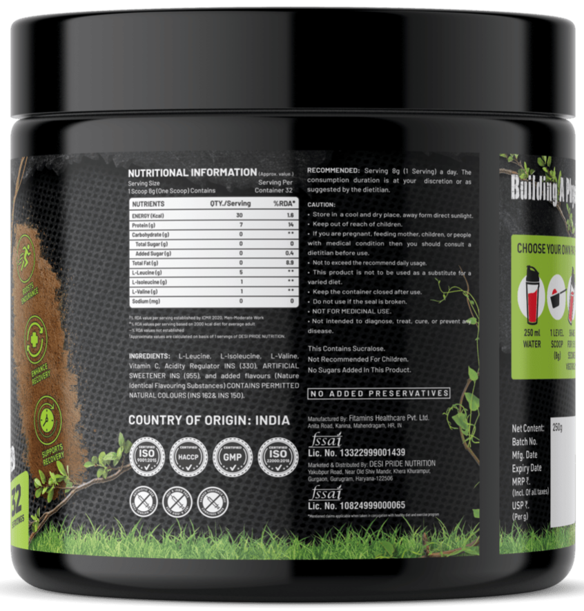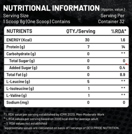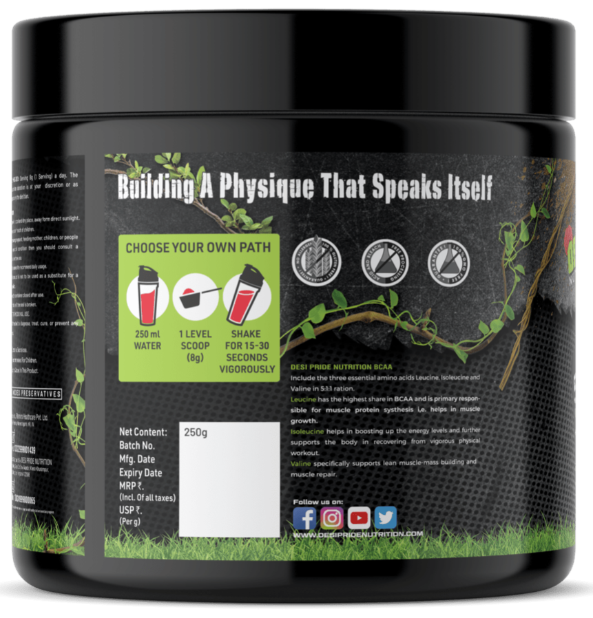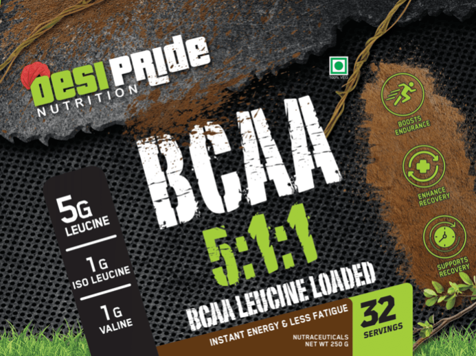 DESI PRIDE NUTRITION BCAA Include the three essential amino acids Leucine, Isoleucine and Valine in 5:1:1 ration.