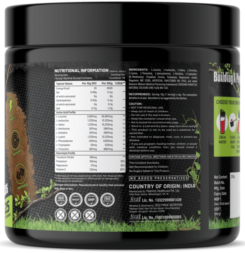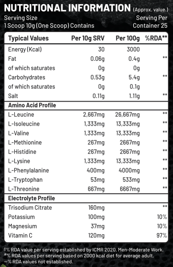 INGREDIENTS: L-Leucine, L-Isoleucine, L-Valine, L-Citrulline, L-Lysine, L-Threonine, L-phenylalanine, L-Histidine, L-Tryptophan, DL-Methionine, Trisodium Citrate, Potassium, Magnesium, Acidity Regulator INS (330), ARTIFICIAL SWEETENER INS (955), and added flavours (Nature Identical Flavouring Substances) CONTAINS PERMITTED NATURAL COLOURS (INS 162& INS 150).