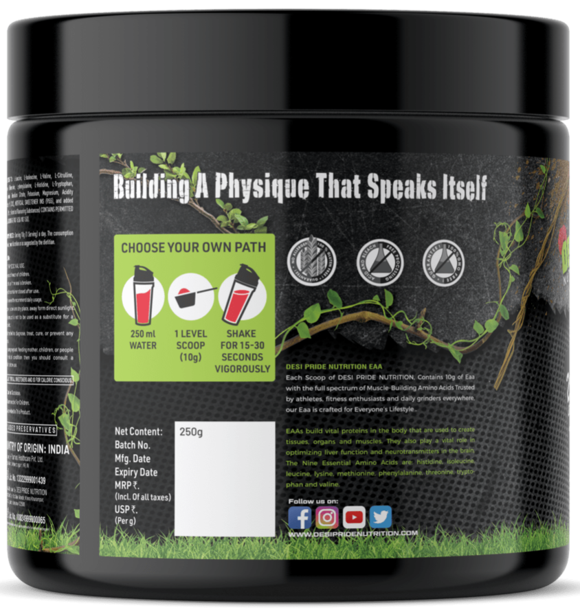 DESI PRIDE NUTRITION EAA Each Scoop of DESI PRIDE NUTRITION, Contains 10g of Eaa with the full spectrum of Muscle-Building Amino Acids Trusted by athletes, fitness enthusiasts and daily grinders everywhere, our Eaa is crafted for Everyone’s Lifestyle .