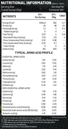 RECOMMENDED: USAGE For adults, add one scoop (33g) to 250-300ml of water or your favourite beverage daily. Serious athletes and bodybuilders (Over 125 pounds) can consume 1-2 scoop immediately after exercise.