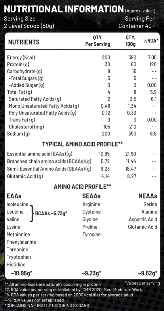 INGREDIENTS: Whey Protein Concentrate, Whey Powder, Sodium Chloride, Cocoa Powder, Milk Powder, Maltodextrin, Dextrose Monohydrate, Sweetner (INS 955, INS 960), Digestive Enzymes, CONTAINS ADDED FLAVOUR (NATURE IDENTICAL FLAVOURING SUBSTANCES).CONTAINS ARTIFICIAL SWEETENER AND FOR CALORIE CONSCIOUS.