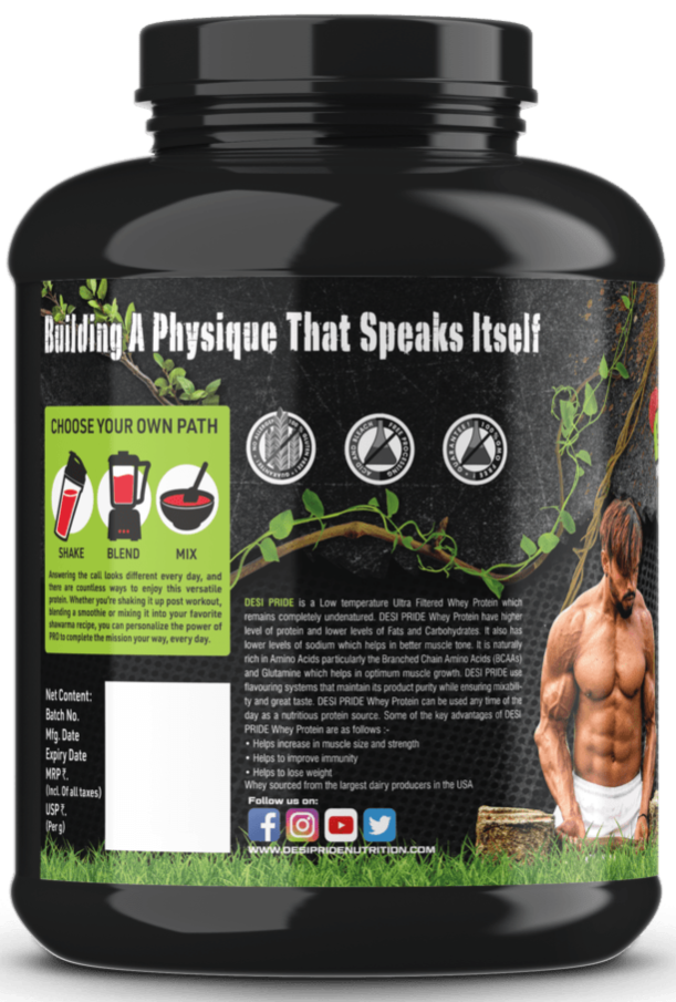 DESI PRIDE is a Low temperature Ultra Filtered Whey Protein which remains completely undenatured. DESI PRIDE Whey Protein have higher level of protein and lower levels of Fats and Carbohydrates. It also has lower levels of sodium which helps in better muscle tone. It is naturally rich in Amino Acids particularly the Branched Chain Amino Acids (BCAAs) and Glutamine which helps in optimum muscle growth. DESI PRIDE use flavouring systems that maintain its product purity while ensuring mixability and great taste. DESI PRIDE Whey Protein can be used any time of the day as a nutritious protein source. Some of the key advantages of DESI PRIDE Whey Protein are as follows :-